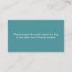 Parfois, même l'empathie a ses limites. Ce carte de visite personnalisé dans un turquoise apaisant exprime poliment votre capacité émotionnelle actuelle. Sur le devant, on peut lire "LÀ, LÀ" en petits caractères au-dessus de "[VOTRE NOM]" et le message direct : "NE PEUT PAS FAIRE FACE À VOS ÉMOTIONS AUJOURD'HUI." L'inverse offre une alternative humoristique au soutien émotionnel : "Veuillez accepter cette carte à la place d'un câlin ou de toute autre forme de confort humain." Parfaites pour les jours où vous devez définir des limites émotionnelles claires avec une touche d'humour, ces cartes personnalisées transmettent le message. Ajoutez simplement votre nom !