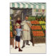 Illustration vintage design d'entreprise de vente au détail mettant en vedette un commis d'épicerie local qui aide un jeune enfant à cueillir des fruits et légumes frais dans les stands du marché des produits. Sa mère vient de terminer ses courses hebdomadaires. Rappel des boutiques de quartier à l'ancienne, de la maman et de la pop corner.