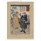 Gravure sur bois japonaise en couleurs, par l'artiste Kuniyoshi Utagawa. L'image est d'un homme supportant une loupe pour regarder l'épéiste samouraï célèbre Miyamoto Musashi. Créé entre 1847 et 1850. Illustration de la Bibliothèque du Congrès, design de carte