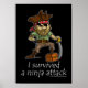 Black poster with a cartoon pirate who has a gray cutlass, an eye patch, a peg leg, a hook, a tattoo that says mom, a brown hat, a boot, a green button up shirt, khaki pants, a red with white spots bandana, a belt with gold buckle, and earrings standing on a treasure chest. Below are the words “I survived a ninja attack.”
