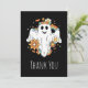 Carte de remerciement avec une illustration d'un fantôme souriant. Décoré de fleurs, d'arcs-en-ciel et de chauves-souris.