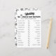 Ajoutez de l'excitation et du rire à votre douche nuptiale, à votre fête de bachelorette ou à votre fête de mariage avec ce jeu Mariage "Voudrait-elle plaire?" ! Les clients auront une idée de ce que veut faire la mariée : est-ce qu’elle aime les stations balnéaires ou le glamping, le chocolat ou la vanille, rester à la maison ou danser jusqu’à l’aube ? Conçu avec un design chic en noir et blanc avec d'élégants accents d'anneau fiançailles, ce jeu est facile à jouer et parfait pour les fêtes de mariée, les douches pour les couples et les festivités mariages. Un must-have pour créer des souvenirs amusants avant le grand jour ! Personnalisable - ajoutez votre spin personnel pour votre prochain événement ! 📌 Parfait pour : ✔️ Réceptions de Mariage & Cocktail Heure ✔️ Fêtes des mariées & Bachelorette Parties ✔️ Engagement Parties & Dîners de Répétition ✔️ Invités Table d'hôtes Activités & brise-glace 🎉 Terminer la collection ! Associez cette recherche de mots mariages à nos autres jeux mariages correspondants pour une expérience d'évènement cohésive et élégante.