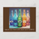 Cette carte postale présente des bouteilles colorées avec des étiquettes qui lisent joie, paix, rire, colère et amour ; le texte en bas déclare : "oubliez tout cela ; et juste du café ?".