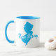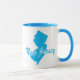 Montrez votre fierté nationale avec ces t-shirts et autres objets qui ont un contour bleu de l'état du New Jersey avec le nom à l'intérieur de la forme.