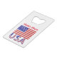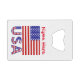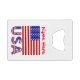 L'ouvre-bouteille personnalisée par carte de crédit présente le drapeau des Etats-Unis d'Amérique avec les lettres USA en bas dans le rouge, blanc et bleu avec étoiles et rayures, trouvé dans le drapeau. Personnalisez en ajoutant un nom pour vous-même ou un cadeau créatif. Idéal pour le Jour de l'Indépendance ou d'autres fêtes patriotiques. Cool à utiliser lors de réunions de famille, de groupes de voyage et de clubs. Excellent cadeau de rembourrage de bas.