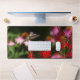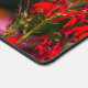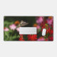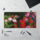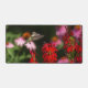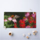 Un colibri s'approche d'une fleur cardinale dans un jardin animé. L'arrière - plan vert foncé met en valeur les fleurs et les oiseaux.