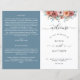 Bienvenue à vos invités avec ce programme de mariage élégant avec vos détails avec bordure fleurie supérieure avec des fleurs d'aquarelle peintes à la main délicatement et le feuillage dans un mélange de rose roux, poussiéreux, ivoire, pêche, ardoise nuageuse bleu, gris et sauge. Deux côtés contrastés en blanc et un élégant s ; couleur arrière - plan bleu foncé/nuageux. Utilisation des détails de calligraphie moderne. Personnalisez le programme des deux côtés. REMARQUE : ce programme arrive à plat et nécessite de plier au milieu pour assembler. Le programme valeur par défaut est recommandé.