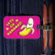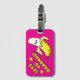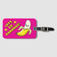 Étiquette de bagage adorable, représentant un dessin animé mignon, un bananier jaune kawaii heureux avec les sourires les plus doux, de grands yeux ronds et à moitié pelé. Au-dessus de lui, en lettrage jaune avec une ombre portée noire indiquant 'Allons Bananes !'. Deux étoiles jaunes brillantes sont de part et d'autre des mots.