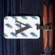 Étiquette de bagages Monogram Watercolor Cette plume de sauce violet et bleu présente votre première en gris foncé. Personnalisez cette étiquette de bagage avec un nom/une initiale ou changez le texte en message personnel. Visitez notre boutique pour la coordination des accessoires.