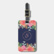 Cette étiquette à bagages présente un design floral d'aquarelle moderne avec roses roses et coraux, feuillage et parties scintillant en or faux rose sur un arrière - plan bleu marine. Personnalisez le monogramme avec votre initiale et ajoutez votre texte de contact à l'arrière,
