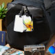L'étiquette parfaite de bagage pour l'amant de plage ou le voyageur d'été avec la conception originale d'art de la peinture pour aquarelle par Sacha Grossel de jaune tropical et de blanc avec le vert de chaux accentue des fleurs de frangipani au foyer étroit, macro style. Cette conception botanique lumineuse, colorée, florale est réminiscente de l'été, de la culture de surf, du temps chaud et d'être près de la plage.