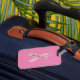 Balise de bagage rose conçue pour le mois de sensibilisation au cancer du sein, Octobre, "Trouvez le remède" carte d'information sur les bagages en valise arrière finissent dans perdu et trouvé.