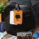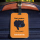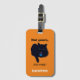 Black cat Cleo sur une étiquette de bagage acrylique orange à un côté. Texte sur le devant personnalisable et personnalisable avec votre nom. Le dos porte la fente de carte pour l'adresse de nom, etc.