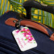 Le tag bagage personnalisé est affiché dans un joli imprimé tropical rose avec juste marié et des noms personnalisés d'échantillon. Montré avec l'emplacement de la carte. Customisez cette balise et changez les noms d'exemples à votre place avec ce modèle.