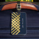 Étirez-vous des autres bagages à la consigne à bagages avec cette élégante étiquette de sac bleu foncé avec un design géométrique en faux or audacieux. Personnalisez cette balise avec vos informations et pour plus d'options comme changer la police et sa taille cliquez sur le bouton "Customiser". *Veuillez noter que le filigrane Zazzle qui apparaît dans l'aperçu du zoom n'apparaîtra PAS sur le produit imprimé final. ©Bois de rose et agrumes