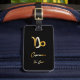 Élégante étiquette à bagages avec signe capricorne or sur arrière - plan noir.