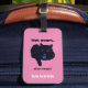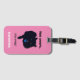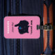 Black cat Cleo sur une étiquette en acrylique rose à un côté. Texte sur le devant personnalisable et personnalisable avec votre nom. Le dos porte la fente de carte pour l'adresse de nom, etc.