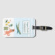 Notre Happy Trails Chig Travels Customizable Luggage Tag présente une adorable illustration d'un Golden Retriever avec son bagage à main sur son trajet pour prendre un vol vers ville d'aventure. Le design comprend un avion de DOGS Airlines décollant dans le ciel bleu et doit avoir des accessoires pour le voyage, un collier pour chien avec étiquette d'os, un collier pour chien avec étiquette d'or, un passeport pour chien et un délice pour os délicieux pour le voyage.