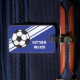 Ce design sportif a un arrière - plan bleu royal avec des rayures blanches en diagonale. Il dispose également d'un ballon de football et permet la personnalisation avec un nom.