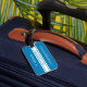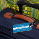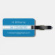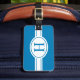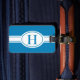 Une étiquette de bagage en bleu avec votre monogramme sur un bouclier ovale blanc avec une bande. Pour des raisons de sécurité, ne mettez jamais votre adresse complète visible sur un étiquette de bagage. C'est pourquoi vous trouvez sur les places à l'arrière pour votre nom, numéro de téléphone et adresse e-mail seulement.
