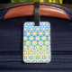 Cette étiquette de valise gaie présente un motif progressiste lumineux en bleu, jaune et vert. Les motifs animés progressent à l'avant comme à l'arrière. Les motifs comprennent des fleurs à six pétales, des étoiles, des diamants et des peignes de miel.