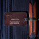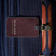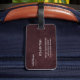 The tag features a structured, geometric aesthetic — think editorial moodboard meets travel essential. The burgundy palette reads as both bold and refined, making it instantly recognizable without veering into loud or cluttered territory. Its minimalist layout ensures the design ages well across every trip.