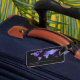 Un bagage moderne et personnalisé avec une carte du monde de l'aquarelle dans un violet plein de vie, sur un arrière - plan noir / charbon de bois foncé. Le design se trouve de part et d'autre de l'étiquette à bagages et vous pouvez facilement customiser avec votre nom et vos coordonnées.