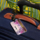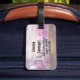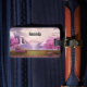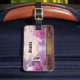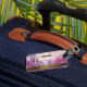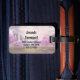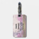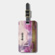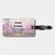 Une étiquette à bagages avec une image pittoresque d'un lac violet paisible. Entouré de cerisiers luxuriants et de cascades.