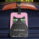 Fat de dessin animé noir gras aux yeux verts. Un joli personnage de chat. Balises de bagages personnalisées avec effet d'ancienne impression appliquée à l'image. Arrière - plan rose. Modifiez le nom pour customiser. Idée cadeau pour les amoureux de les chats.