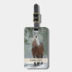 Une étiquette de valise avec la photo d'un cheval brun avec une longue crinière blanche. Debout dans une forêt avec des flocons de neige qui tombent tout autour.
