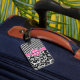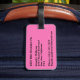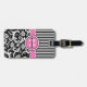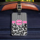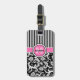 Easily find your bag at the airport with this fabulously chic black and white floral damask and stripes pattern with a lovely pink circle medallion on the front side that has your first name and last initial on it. The backside is all pink with black lettering that you customize with your own contact details.