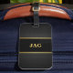 A modern black carbon-like monogrammed design with classy gold accents on the initials. Perfect for your business travel events when you want to make a good impression.