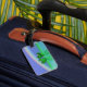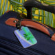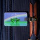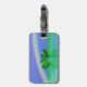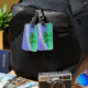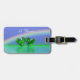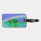 Marque à bagages avec mon oeuvre de deux coeurs vert émeraude flottant sur l'eau sous un arc-en-ciel. Le texte dit "55 ans".