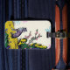 A stylized purple and blue sighthound rests within a vibrant landscape inspired by traditional Asian screen paintings and modern pop art on this luggage tag. Bold halftone dots and thick black outlines define the lean canine, contrasted against bright yellow terrain and deep green rock formations. Pink blossoms and floating clusters of colorful dots add a whimsical, graphic touch. This design offers a striking fusion of classical composition and contemporary comic book aesthetics.