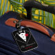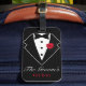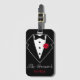 Étiquette de bagage personnalisable avec noeud papillon noir et tuxedo avec rose rouge. Personnalisez avec le nom du marié pour un week-end d'enterrement de vie de garçon ou de lune de miel. Amusante étiquette de bagage pour retrouver facilement votre sac à la carousel à bagages de l'aéroport pour les affaires ou le plaisir.