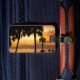 L'arrangement du soleil dans Tarpon Springs, la Floride avec une famille jouant à l'arrière-plan. Le soleil était particulièrement vibrant ce jour avec le tourbillonnement jaune, orange, rouge et gris dans le ciel. Les palmiers silhouettés sur la plage donnent vraiment à la photo une sensation tropicale.