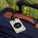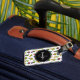 Une étiquette de bagage avec un motif mignon et amusant. Illustrations de différents cactus, assis dans des pots de fleurs avec des visages joyeux et souriants caricaturaux.