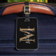 Elegant black and gold monogram luggage tag with customizable script name. A stylish, durable travel accessory for easy bag identification and modern personalization.