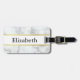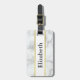 Cette étiquette à bagages a un arrière - plan en marbre blanc imitation. Sur le devant, vous pouvez personnaliser la balise de bagage avec le texte désiré, tel que votre prénom (indiqué : Elizabeth). Au verso, vous customisez davantage avec le message désiré, tel que votre nom complet, votre adresse et votre numéro de téléphone en texte noir au centre sur une bande blanche. Une ligne d'or fausse (pas de feuille) est au-dessus et au-dessous du texte.