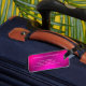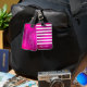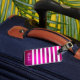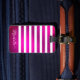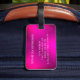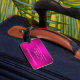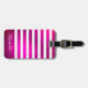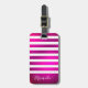 Créez une étiquette de bagage lumineuse avec un design rose et blanc fuchsia. Le texte modèle vous permet de taper facilement votre nom, adresse, téléphone et autres informations de contact. Le côté arrière est en violet avec du texte blanc, les rayures sont sur le côté avant seulement.