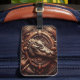Vue rapprochée de la tête d'un alligator sculpté, entourée de motifs et de textures complexes, créant un sentiment de puissance et de mystère.