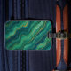 A texture featuring blue green marble strands and wavy patterns. This visually rich pattern features deep, undulating ribbons of vibrant emerald green, jade, and dark forest green. The rhythmic waves are elegantly traced by fine lines of gold. This texture exudes a sense of deep, natural luxury, sophistication, and exotic flair. Strong, wavy, and parallel lines create a sense of continuous, organic motion and visual rhythm. Dominated by deep, saturated shades of green that convey vitality, wealth, and natural beauty.
