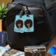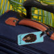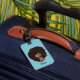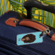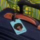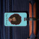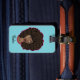 Cette marque de bagage est composée de "Queen, phénoménal, beau, intelligent, magique, patron, aimant, sexy, indépendant, drôle, créatif et fort" niché dans son afro, avec colliers multicolores, bordure rose et arrière - plan turquoise.
