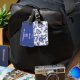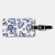 Cette étiquette de bagage à thème volleyball comporte un motif aléatoire de volleyballs de taille variée avec des panneaux bleus, gris et blancs sur un arrière - plan blanc - personnalisez avec du monogramme sur le devant, l'adresse sur le dos - les panneaux bleus et gris des volleyballs apparaissent texturés, mélangés avec un motif girly, artsy, floral - par katz_d_zynes