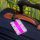 Design graphique de pois colorés (rose, jaune, vert, turquoise). Il s'agit d'un modèle, vous pouvez écrire votre nom et adresse sur la bande rose ou vous pouvez supprimer la bande rose ainsi que le nom et l'adresse.