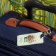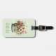 Un porte-étiquette de bagage avec un pot de fleurs fantaisiste et élégant. Couleurs vert, rose et crème. Installé dans un pot vert avec un tissu à carreaux. Ambiance shabby vintage.