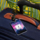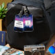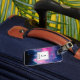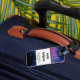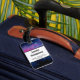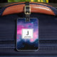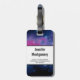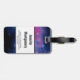 Une étiquette de bagage avec une belle conception abstraite en rose et bleu. Des étoiles blanches parsemèrent cette image du cosmos. Trippy et cool. Un carré blanc avec une bordure noire superposée avec votre premier monogramme à l'intérieur. Informations personnalisées sur le dos.