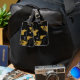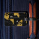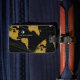 Faux carte dorée du monde sur arrière - plan noir, avec l'image d'un petit avion, personnalisée avec le nom et les initiales du voyageur élégant, pour voyager dans le style...