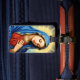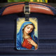 Ce design, beau et classique, présente un portrait de la Vierge Marie à l'expression sereine et aux yeux fermés, véhiculant un profond respect et une méditation paisible. Elle est habillée d'un voile bleu traditionnel et d'une robe rouge, avec un halo doré éclatant qui illumine la tête. Le portrait est encadré par une bordure décorative et ornée, lui donnant une qualité intemporelle et spirituelle. Cette conception est polyvalente pour une gamme de produits avec un thème religieux ou dévotionnel. Imaginez-le sur des gravures d'art religieux, des articles d'église, des articles de papeterie inspirants ou des décors de maison spirituelle."