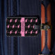 Bright pink cartoon flamingos stand against a black background, creating a luggage tag that is cute and fun! Easy to spot on a luggage cart or carousel.